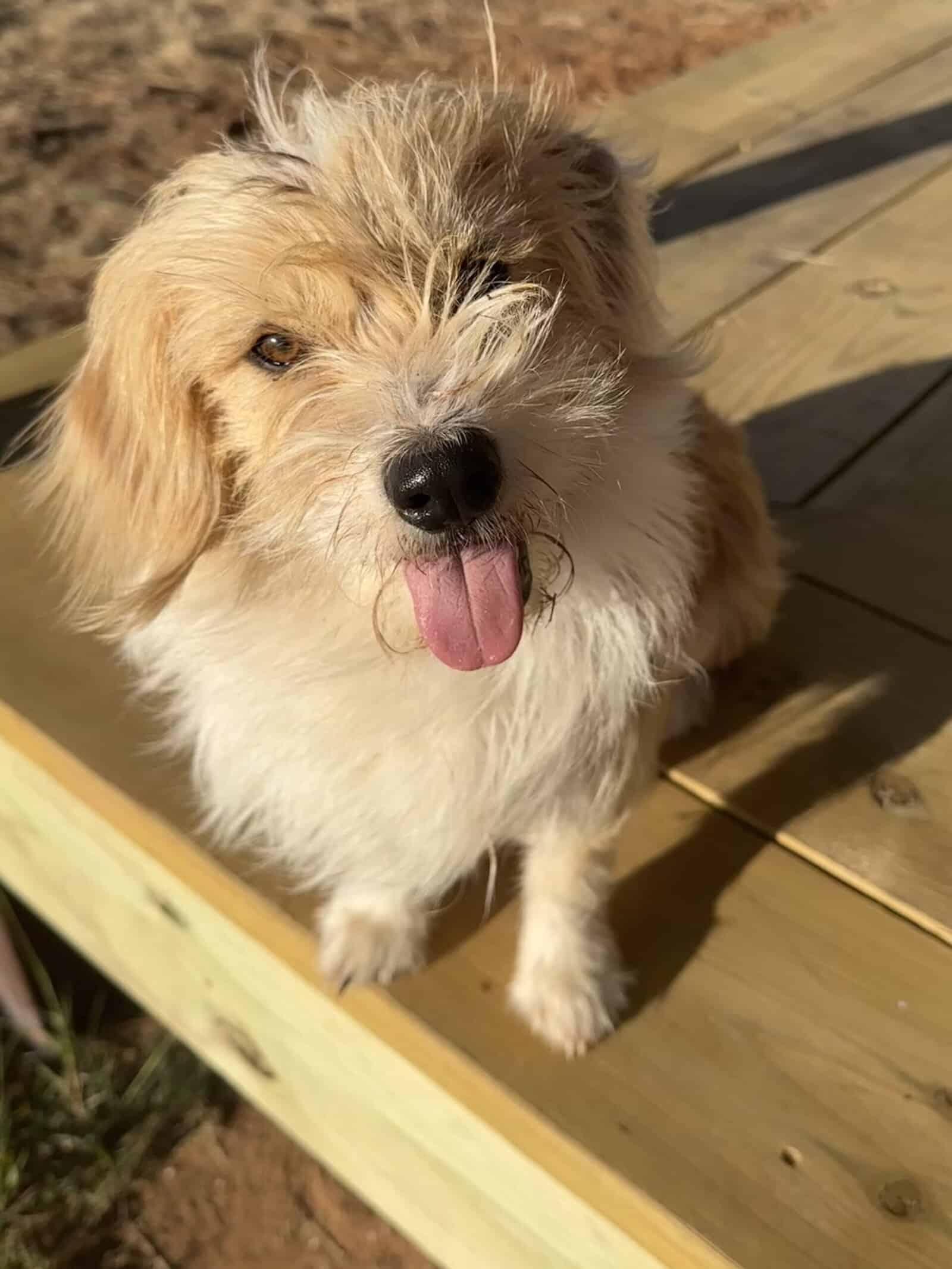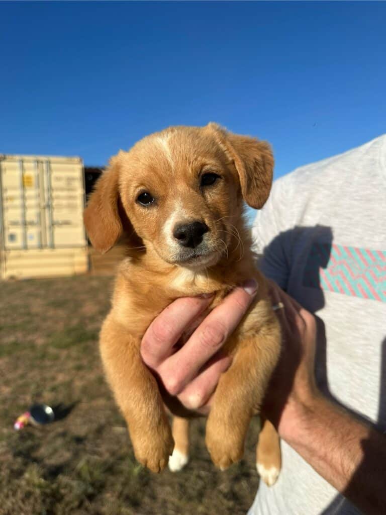 This is our only male available. We call him Sugar Cookie. He is fun and like all puppies loves to run around. He appears to take after the poodle side of the corgipoo in his legs.