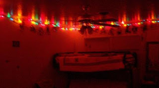 The boys went all out and have Christmas light going from one corner of the room to the opposite corner and then sort or higgly piggly. The effect is a sort of glowing, drapey spiderweb! We did insist that they unwrap it from the ceiling fan just in case it got turned on!