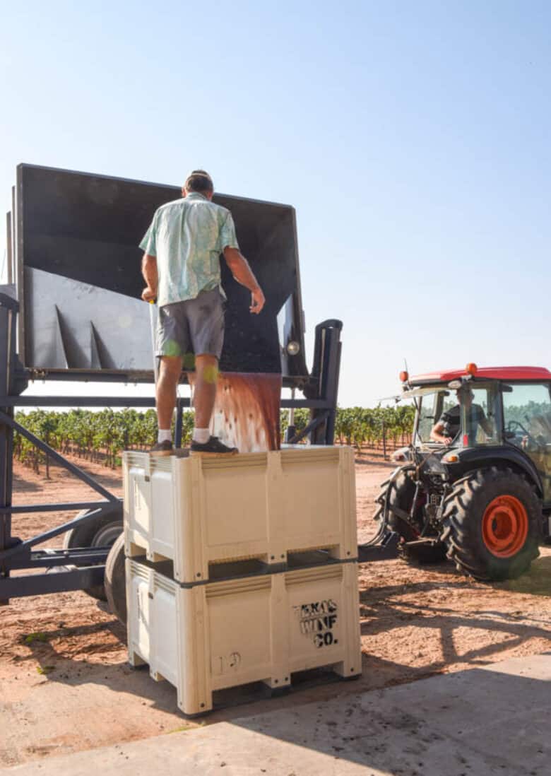 After we load the bins up with grapes, we stack and weigh them. Then load them into the semi truck to be taken to the winery!